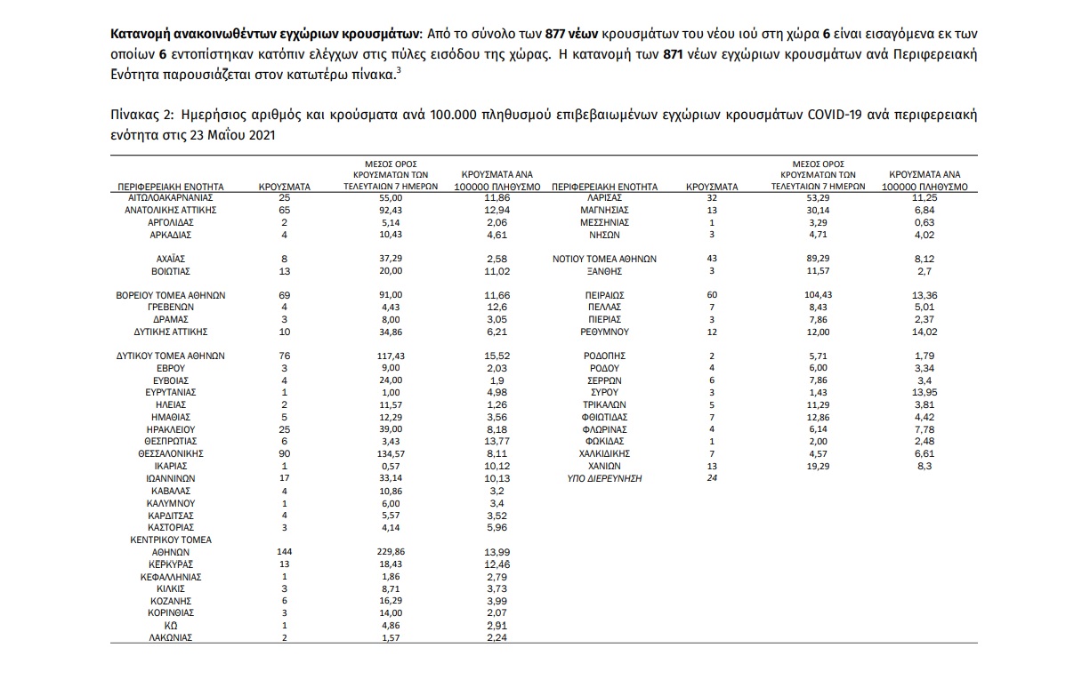 Τα νέα εργαστηριακά επιβεβαιωμένα κρούσματα της νόσου που καταγράφηκαν τις τελευταίες 24 ώρες είναι 877, εκ των οποίων 6 εντοπίστηκαν κατόπιν ελέγχων στις πύλες εισόδου της χώρας. Ο συνολικός αριθμός των κρουσμάτων ανέρχεται σε 389.804