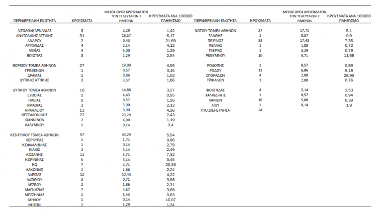Με βάση τα επιβεβαιωμένα κρούσματα των τελευταίων 7 ημερών, 38 θεωρούνται σχετιζόμενα με ταξίδι από το εξωτερικό και 578 είναι σχετιζόμενα με ήδη γνωστό κρούσμα.