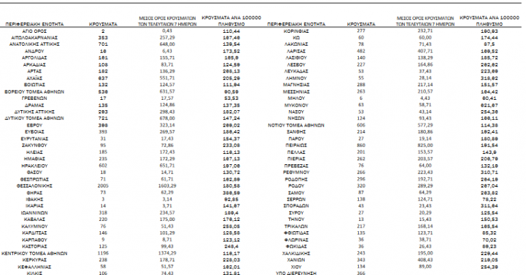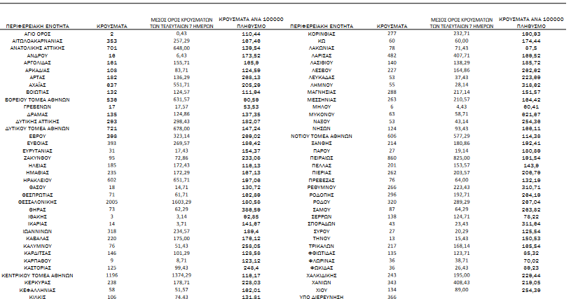 Με βάση τα επιβεβαιωμένα κρούσματα των τελευταίων 7 ημερών, 381 θεωρούνται σχετιζόμενα με ταξίδι από το εξωτερικό και 1.372 είναι σχετιζόμενα με ήδη γνωστό κρούσμα.