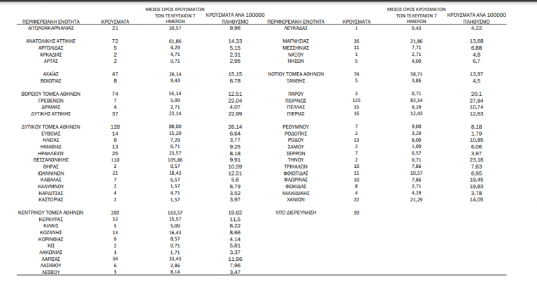 Με βάση τα επιβεβαιωμένα κρούσματα των τελευταίων 7 ημερών, 37 θεωρούνται σχετιζόμενα με ταξίδι από το εξωτερικό και 1.863 είναι σχετιζόμενα με ήδη γνωστό κρούσμα.