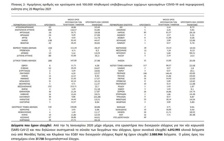 (ημερήσια μεταβολή +1.1%), εκ των οποίων 51.6% άνδρες. Με βάση τα επιβεβαιωμένα κρούσματα των τελευταίων 7 ημερών, 67 θεωρούνται σχετιζόμενα με ταξίδι από το εξωτερικό και 2.362 είναι σχετιζόμενα με ήδη γνωστό κρούσμα.