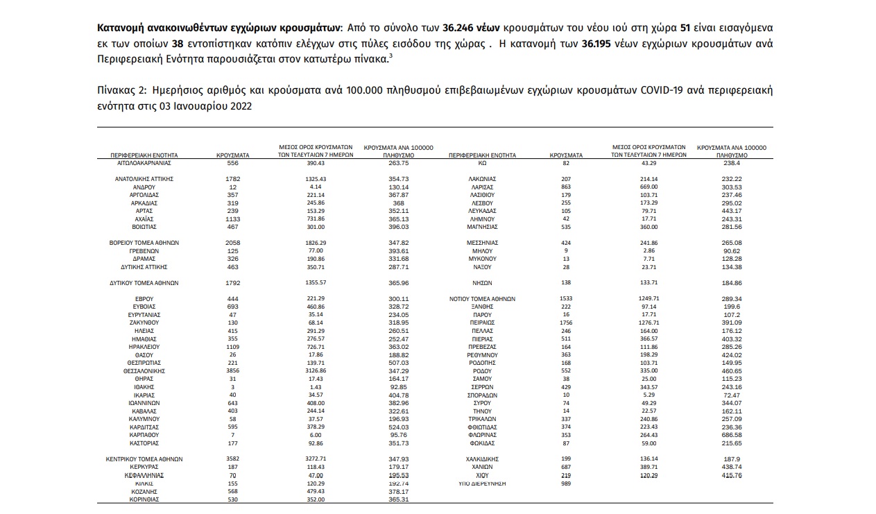 H σημερινή ανακοίνωση του ΕΟΔΥ: «τα νέα εργαστηριακά επιβεβαιωμένα κρούσματα της νόσου που καταγράφηκαν τις τελευταίες 24 ώρες είναι 36.246, εκ των οποίων 38 εντοπίστηκαν κατόπιν ελέγχων στις πύλες εισόδου της χώρας. Ο συνολικός αριθμός των κρουσμάτων ανέρχεται σε 1.294.741 (ημερήσια μεταβολή +2.9%), εκ των οποίων 50.3% άνδρες. Με βάση τα επιβεβαιωμένα κρούσματα των τελευταίων 7 ημερών, 217 θεωρούνται σχετιζόμενα με ταξίδι από το εξωτερικό και 1.000 είναι σχετιζόμενα με ήδη γνωστό κρούσμα.