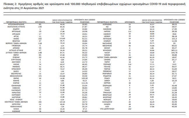 Τα νέα εργαστηριακά επιβεβαιωμένα κρούσματα της νόσου που καταγράφηκαν τις τελευταίες 24 ώρες είναι 3.628, εκ των οποίων 25 εντοπίστηκαν κατόπιν ελέγχων στις πύλες εισόδου της χώρας. Ο συνολικός αριθμός των κρουσμάτων ανέρχεται σε 587.964 (ημερήσια μεταβολή +0.7%), εκ των οποίων 51.1% άνδρες. Με βάση τα επιβεβαιωμένα κρούσματα των τελευταίων 7 ημερών, 206 θεωρούνται σχετιζόμενα με ταξίδι από το εξωτερικό και 1.404 είναι σχετιζόμενα με ήδη γνωστό κρούσμα.