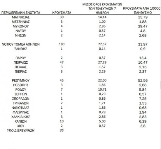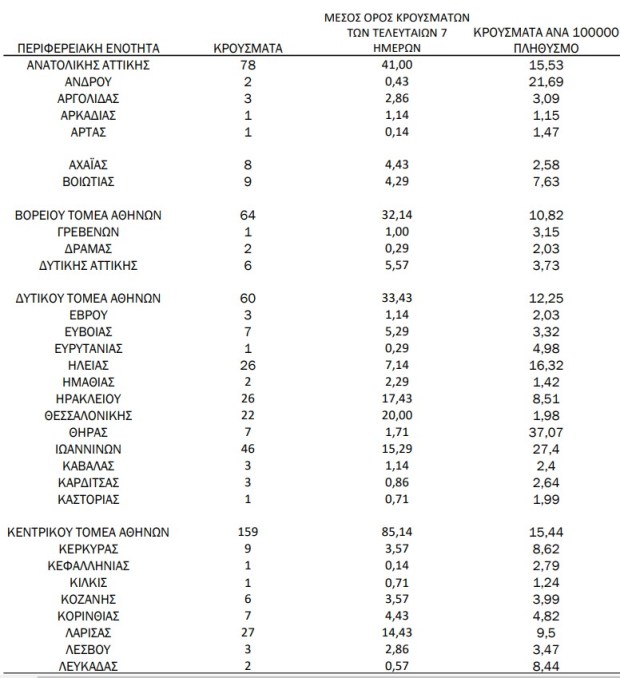 Με βάση τα επιβεβαιωμένα κρούσματα των τελευταίων 7 ημερών, 114 θεωρούνται σχετιζόμενα με ταξίδι από το εξωτερικό και 962 είναι σχετιζόμενα με ήδη γνωστό κρούσμα.