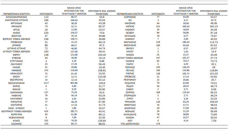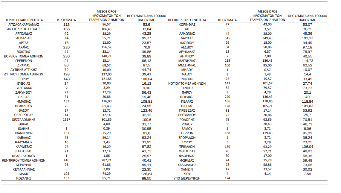 Με βάση τα επιβεβαιωμένα κρούσματα των τελευταίων 7 ημερών, 148 θεωρούνται σχετιζόμενα με ταξίδι από το εξωτερικό και 2.589 είναι σχετιζόμενα με ήδη γνωστό κρούσμα.