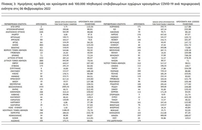 57 εντοπίστηκαν κατόπιν ελέγχων στις πύλες εισόδου της χώρας. Ο συνολικός αριθμός των κρουσμάτων ανέρχεται σε 2.047.849 (ημερήσια μεταβολή +0.5%), εκ των οποίων 49.8% άνδρες. Με βάση τα επιβεβαιωμένα κρούσματα των τελευταίων 7 ημερών, 383 θεωρούνται σχετιζόμενα με ταξίδι από το εξωτερικό και 2.500 είναι σχετιζόμενα με ήδη γνωστό κρούσμα.