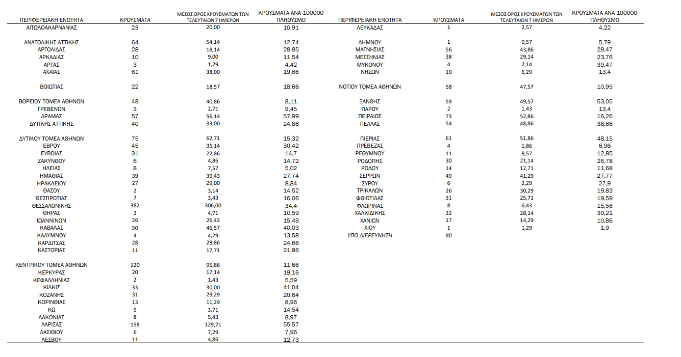 Με βάση τα επιβεβαιωμένα κρούσματα των τελευταίων 7 ημερών, 114 θεωρούνται σχετιζόμενα με ταξίδι από το εξωτερικό και 3.126 είναι σχετιζόμενα με ήδη γνωστό κρούσμα.