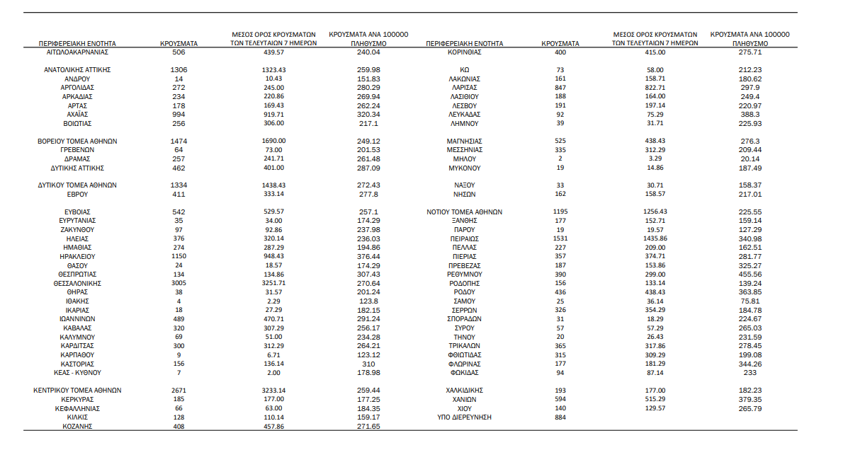H σημερινή ανακοίνωση του ΕΟΔΥ: «Τα νέα εργαστηριακά επιβεβαιωμένα κρούσματα της νόσου που καταγράφηκαν τις τελευταίες 24 ώρες είναι 29.334, εκ των οποίων 87 εντοπίστηκαν κατόπιν ελέγχων στις πύλες εισόδου της χώρας.