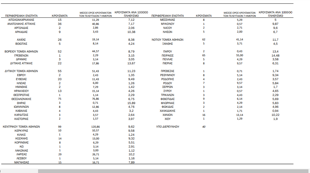 Με βάση τα επιβεβαιωμένα κρούσματα των τελευταίων 7 ημερών, 38 θεωρούνται σχετιζόμενα με ταξίδι από το εξωτερικό και 1.681 είναι σχετιζόμενα με ήδη γνωστό κρούσμα.