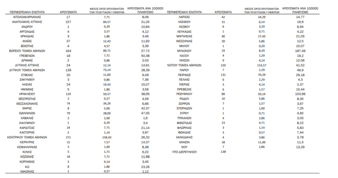 Με βάση τα επιβεβαιωμένα κρούσματα των τελευταίων 7 ημερών, 146 θεωρούνται σχετιζόμενα με ταξίδι από το εξωτερικό και 1.769 είναι σχετιζόμενα με ήδη γνωστό κρούσμα.