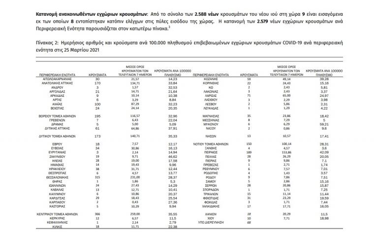 Σε 2.588 ανήλθαν τα νέα κρούσματα κορονοϊού στη χώρα μας, ενώ νέο αρνητικό ρεκόρ κατέγραψε ο αριθμός των διασωληνωμένων ασθενών που αυξήθηκαν στους 706. Η Covid-19 στοίχισε τη ζωή σε 52 ανθρώπους μέσα σε ένα 24ωρο, όπως ανακοίνωσε ο ΕΟΔΥ την Πέμπτη.