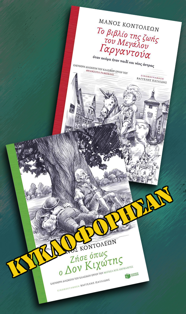 Γνωστή είναι η παροιμία πως αν δεν παινέψεις το σπίτι σου θα πέσει να σε πλακώσει. Επειδή λοιπόν δεν έχω όρεξη να μου συμβεί κάτι τέτοιο, γι αυτό και επανέρχομαι -με την άδειά σας- στο ίδιο θέμα. Μου πήρε σχεδόν δυο χρόνια να τα εικονογραφήσω (δουλεύω αργά γιατί το διασκεδάζω) και τώρα μπήκαν στα ράφια των βιβλιοπωλείων. Δυο βιβλία του Μάνου Κοντολέων από τις εκδόσεις Πατάκη, διακευές δυο μεγάλων κλασσικών: του Γαργαντούα και του Δον Κιχώτη. Ευχηθήτε τους να είναι καλοτάξιδα καθώς ξεκινούν το ταξείδι τους στον απέραντο ωκεανό του βιβλίου και… μην περιμένετε, πάρτε τα στο σπίτι, αξίζουν τον κόπο. Αλήθεια λέω. pavlidiscartoons.com/blog