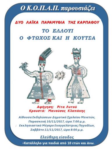 ΔΕΛΤΙΟ ΤΥΠΟΥ-Θέμα: Σας προσκαλούμε να παρακολουθήσετε τις παραστάσεις δύο λαϊκών παραμυθιών της Καρπάθου, σε αφήγηση της συμπατριώτισσας μας ηθοποιού κ. Ρίτας Λυτού, η οποία με μεγάλη επιτυχία πραγματοποησε τις παραστάσεις αυτές στο ΘΕΑΤΡΟ ΣΦΕΝΔΟΝΗ στην Αθήνα. . Οι παραστάσεις πραγματοποιούνται στο πλαίσιο του 4ου κύκλου Καρπαθιακής Λαογραφίας που πραγματοποιείται στο νησί μας (5-12/11)