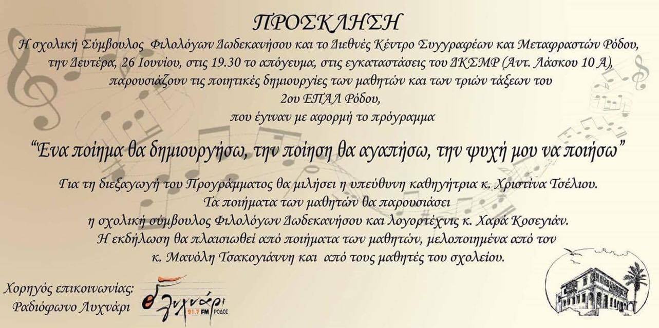 Σας προσκαλούμε τη Δευτέρα 26 Ιουνίου 2017 στις 7.30 μ.μ. στις εγκαταστάσεις του Διεθνούς Κέντρου Συγγραφέων και Μεταφραστών Ρόδου του ΔΟΠΑΡ όπου θα πραγματοποιηθεί η εκδήλωση με το 2ο ΕΠΑΛ Ρόδου με τίτλο «Ένα ποίημα θα δημιουργήσω, την ποίηση θα αγαπήσω, την ψυχή μου να ποιήσω». Θα παρουσιαστούν οι ποιητικές δημιουργίες των μαθητών και μαθητριών και των τριών τάξεων του σχολείου που προέκυψαν στο πλαίσιο του ομώνυμου εκπαιδευτικού προγράμματος. Η καθηγήτρια Χριστίνα Τσέλιου θα μιλήσει για το πρόγραμμα ενώ η σχολική σύμβουλος φιλολόγων Δωδεκανήσου Χαρά Κοσεγιάν θα παρουσιάσει τα ποιήματα των παιδιών. Η εκδήλωση θα πλαισιωθεί από ποιήματα των παιδιών που μελοποίησε Μανόλη Τσακογιάννη.