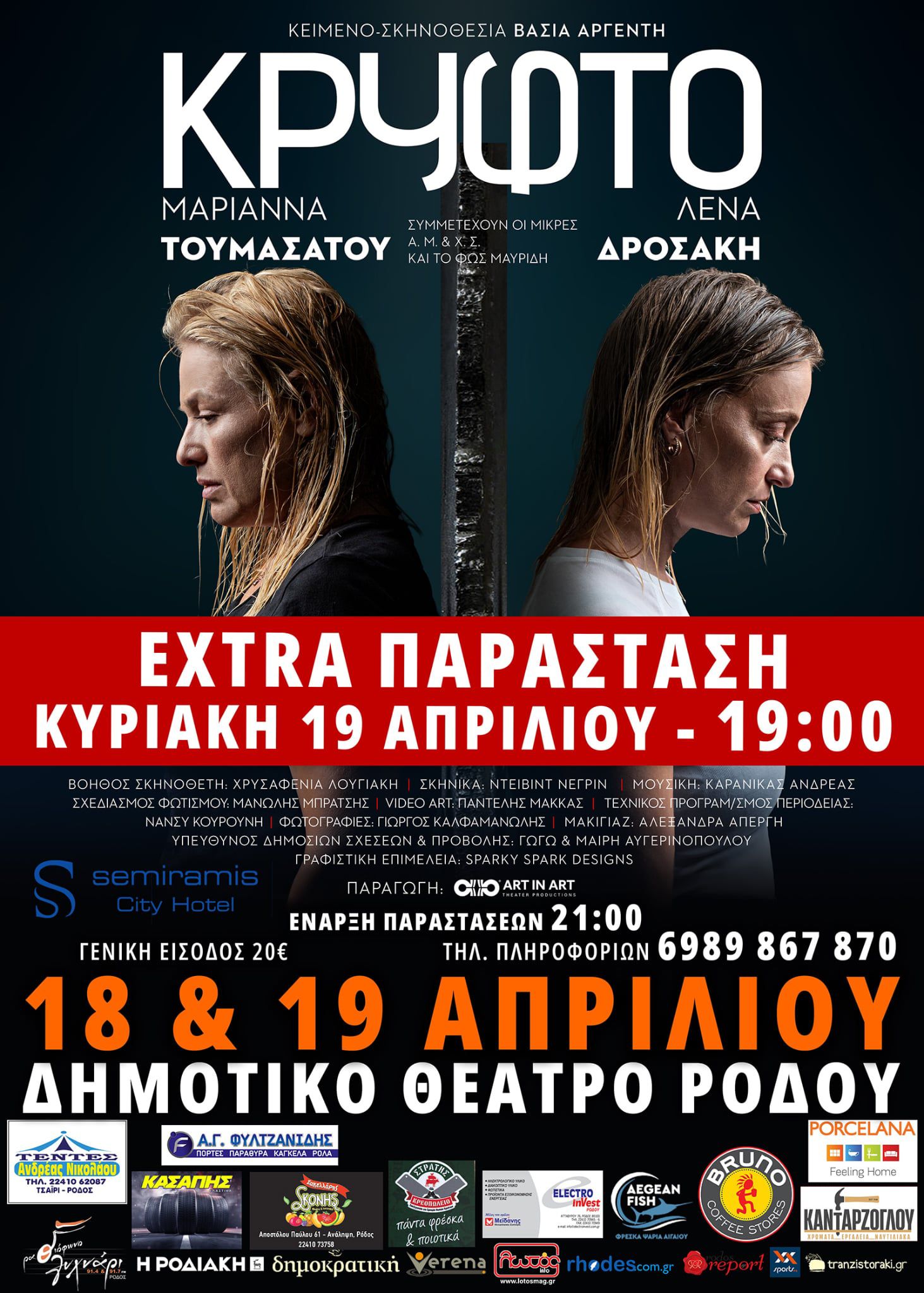 Λόγω της μεγάλης ζήτησης θα υπάρξει επιπλέον παράσταση την ΚΥΡΙΑΚΗ 19 Απριλίου στις 19:00 το απόγευμα.