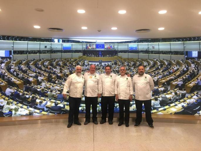 ΕΥΡΩΚΟΙΝΟΒΟΥΛΙΟ-Μάγεψαν τις Βρυξέλλες οι γεύσεις του Αιγαίου -Η ΛΕΣΧΗ ΑΡΧΙΜΑΓΕΙΡΩΝ ΔΩΔΕΚΑΝΗΣΟΥ ΚΥΚΛΑΔΩΝ ΑΝΕΔΕΙΞΕ ΤΙΣ ΓΕΥΣΕΙΣ ΤΟΥ ΑΙΓΑΙΟΥ ΣΤΟ ΕΥΡΩΚΟΙΝΟΒΟΥΛΙΟ ΣΤΗΝ ΕΚΔΗΛΩΣΗ ΓΙΑ ΤΗΝ ΕΝΣΩΜΑΤΩΣΗ -Η «κουζίνα του Αιγαίου» μάγεψε τις Βρυξέλλες και τους Ευρωβουλευτές στην ειδική εορταστική εκδήλωση για την ενσωμάτωση της Δωδεκανήσου με την μητέρα Ελλάδα. Την εκδήλωση οργάνωσε ο ευρωβουλευτής κ. Στέλιος Κούλογλου με την βοήθεια του δωδεκανήσιου βουλευτή κ. Δημήτρη Γάκη. Το όλο εορταστικό πρόγραμμα εκτός από τις ομιλίες και τους χαιρετισμούς περιελάμβανε προβολή ειδικού ντοκυμαντέρ «Το χρονικό της ενσωμάτωσης», από την πολιτιστική ομάδα Αρχιπέλαγος και παραδοσιακούς δωδεκανησιακούς χορούς από το Λύκειο Ελληνίδων Βρυξελλών. Η Λέσχη Αρχιμαγείρων Δωδεκανήσου Κυκλάδων έδωσε το μοναδικό γευστικό στίγμα της κουζίνας του Αιγαίου στην εκδήλωση. Η ομάδα των σεφ προμηθεύτηκαν υλικά από τα νησιά και τη θάλασσα, προσφορές παραγωγών μας, μαγείρεψε και μοσχοβόλισε Αιγαίο η ειδικά διαμορφωμένη αίθουσα για την εκδήλωση. Ευρωβουλευτές και καλεσμένοι, εντυπωσιάστηκαν και χωρίς φειδώ έπλεξαν διθυράμβους για τις γεύσεις της Aegean cuisine. Με υπερηφάνεια και συγκίνηση οι σεφ παρουσίασαν την κουζίνα του Αιγαίου στην καρδιά των εξελίξεων και της Ευρώπης. Η Λέσχη αισθάνεται την υποχρέωση να ευχαριστήσει δημόσια όλους όσους συνέβαλαν στην επιτυχία της παρουσίασης της Aegean cuisine και ιδιαίτερα το Επιμελητήριο Δωδεκανήσου, τον κ. Απόστολο Ασπράκη της εταιρείας «Αριστον», τον κ. Απόστολο Δημελη της εταιρείας <<τροφοσύνθεση>>, τον Δήμο Καλύμνου, το τυροκομείο Παναγιώτη Γιάννου της Κω, τις επιχειρήσεις Μελισσοκομική, Φίλεμα, Ατσαλάκης, Χειρομήλια, καθώς επίσης και όλους τους παραγωγούς που προσέφεραν απλόχερα τα είδη τους. Ενδεικτικά, το μενού περιελάμβανε λεπτές φέτες λαυράκι πάνω σε πλιγούρι με περγαμόντο, λεβάντα και χαμομήλι, φιλέτο κουτσομούρας με πουρέ από άγρια χόρτα ελαιόλαδο και μηλόξυδο, χταπόδι βραστό με κόκκινο κρασί σκορδαλιά με τρούφα και γλυκό λεμόνι, κοπανιστή με μυρμιζέλι, κρασοτύρι Κώτικο με μαρμελάδα ντομάτας, κρέμα λεριώτικου παστού τυριού, λεριώτικο σε νοτισμένο ψωμί παστό κολιό, πατηνιώτικα τυροπιτάκια, λαδόπιτες, γιαπράκια, και από γλυκά, μελεκούνι, συκόπαστο, μοσχοπούγγια, αμυγδαλωτά, μαντινάδες. Τον πρόεδρο της Λέσχης Αρχιμαγείρων Δωδεκανήσου και Κυκλάδων κ. Νίκο Χριστοφόρου, συνόδευσαν τα μέλη Επαμεινώνδας Τσίντζος, Παναγιώτης Παρατσώκας, Εμμανουήλ Χατζημπούμπουλης, Ευριπίδης Γκόγκος και Δημήτρης Κουλιάς.