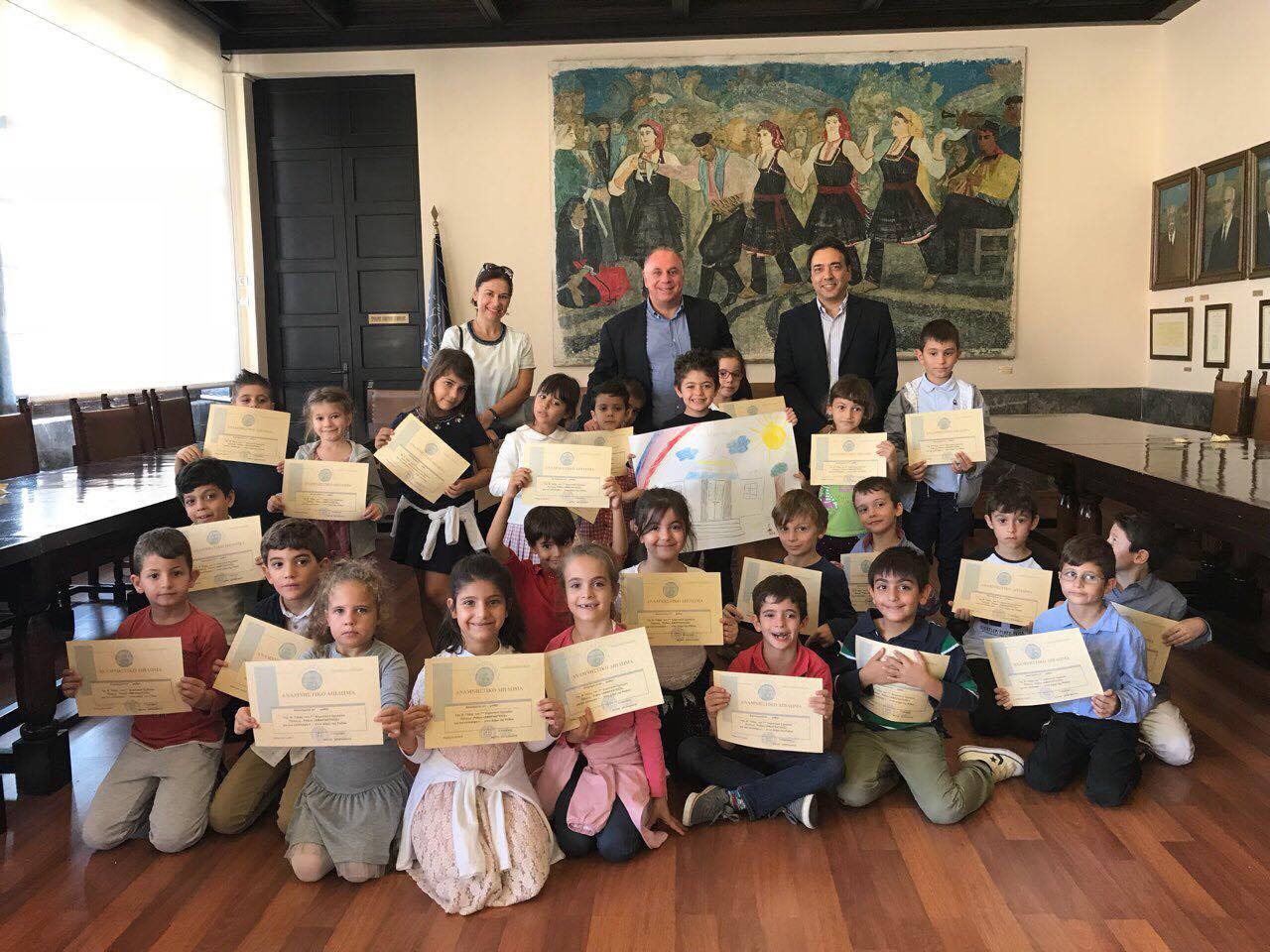 ΔΗΜΟΣ ΡΟΔΟΥ-Διεύθυνση Παιδείας, Πολιτισμού και Αθλητισμού Τμήμα Παιδείας και Δια Βίου Μάθησης -Ρόδος 23-10-2017 -δελτίοτύπου -Θέμα: Μαθητές της Αμαράντειου Σχολής, ευχαριστούν το Δήμαρχο Το Δημαρχιακό Μέγαρο επισκέφθηκαν τη Δευτέρα 23 Οκτωβρίου 2017, οι μαθητές της Β΄τάξης του 7ου Δημοτικού Σχολείου Πόλεως Ρόδου (Αμαραντείου Σχολής), συνοδευόμενοι από τη δασκάλα τους, κ. Ανδρομάχη Κοτσίφη. Σκοπός της επίσκεψής τους ήταν να ευχαριστήσουν προσωπικά τον Δήμαρχο Ρόδου κ.Φώτη Χατζηδιάκο για παρεμβάσεις βελτίωσης που έγιναν στο σχολείο τους και κυρίως για την ολοκλήρωση της τοποθέτησης νέου τάπητα στον προαύλιο χώρο του Σχολείου. Λόγω ανειλημμένης υποχρέωσης του Δημάρχου Ρόδου, τους μαθητές υποδέχθηκε ο Δημαρχεύων Αντιδήμαρχος κος Σάββας Διακοσταματίου. Η πρωτοβουλία τους ήταν ιδιαίτερα συγκινητική, αφού εξέφρασαν τις ευχαριστίες τους, παραδίδοντας μεγάλη ζωγραφιά και στίχους. Στα παιδιά δόθηκαν αναμνηστικά διπλώματα της επίσκεψής τους στο Δημαρχείο.