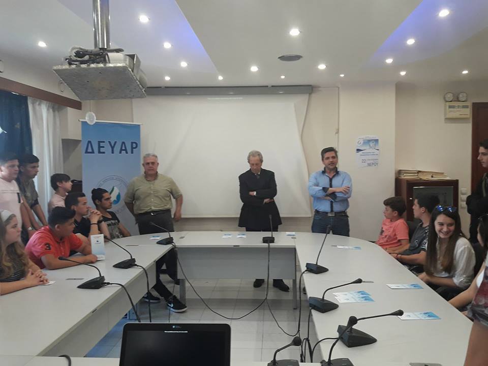 ΔΕΛΤΙΟ ΤΥΠΟΥ -Συνεχίζονται οι δράσεις εκπαιδευτικού χαρακτήρα της ΔΕΥΑΡ που έχουν ως στόχο την ενημέρωση και ευαισθητοποίηση των μαθητών της Ρόδου, για την εξοικονόμηση του νερού, ως του πολυτιμότερου αγαθού που προσφέρει η φύση. Την Πέμπτη 3 Μαΐου μαθητές της Β΄ τάξης και της Περιβαλλοντικής Ομάδας του Γυμνασίου Γενναδίου επισκέφθηκαν το κεντρικό κτήριο της ΔΕΥΑΡ συνοδευόμενοι από τις εκπαιδευτικούς Αλεξίου Σοφία (ΠΕ11), Μητροπούλου Δώρα (ΠΕΟ4.02) και Τσιαπαρα Βασιλική (ΠΕΟ3). Τους μαθητές καλωσόρισε ο Πρόεδρος του Δ.Σ κ. Αλέξανδρος Μανωλάκης, όπου αναφέρθηκε στη μέγιστη σημασία του νερού για τη ζωή του ανθρώπου και τη βιωσιμότητα του πλανήτη. Οι συμμετέχοντες ενημερώθηκαν από το Γενικό Διευθυντή ΔΕΥΑΡ κ. Εμμανουήλ Διακομανώλη, για τη λειτουργία, τα έργα και τις αρμοδιότητές της επιχείρησης καθώς και για τον κύκλο του νερού. Ο κ. Παναγιώτης Καραβόλιας Διευθυντής Υπηρεσίας της ΔΕΥΑΡ, αναφέρθηκε στο ρόλο που διαδραματίζουν οι υπηρεσίες της επιχείρησης στη διαχείριση και διάθεση του νερού όπως και σε πρακτικές οδηγίες εξοικονόμησης νερού στην καθημερινότητα. Συζητήθηκαν επίσης τα προβλήματα ύδρευσης και άρδευσης που αντιμετωπίζουν πολλές περιοχές της Νότιας Ρόδου και δόθηκαν απαντήσεις από πλευράς ΔΕΥΑΡ για τις προσπάθειες που καταβάλλονται για την επίλυση τους. Τα παιδιά έδειξαν ενημερωμένα σε θέματα προστασίας του περιβάλλοντος, ενθουσιάστηκαν από την παρουσίαση και εξέφρασαν την επιθυμία να επισκεφθούν και άλλες εγκαταστάσεις της ΔΕΥΑΡ.