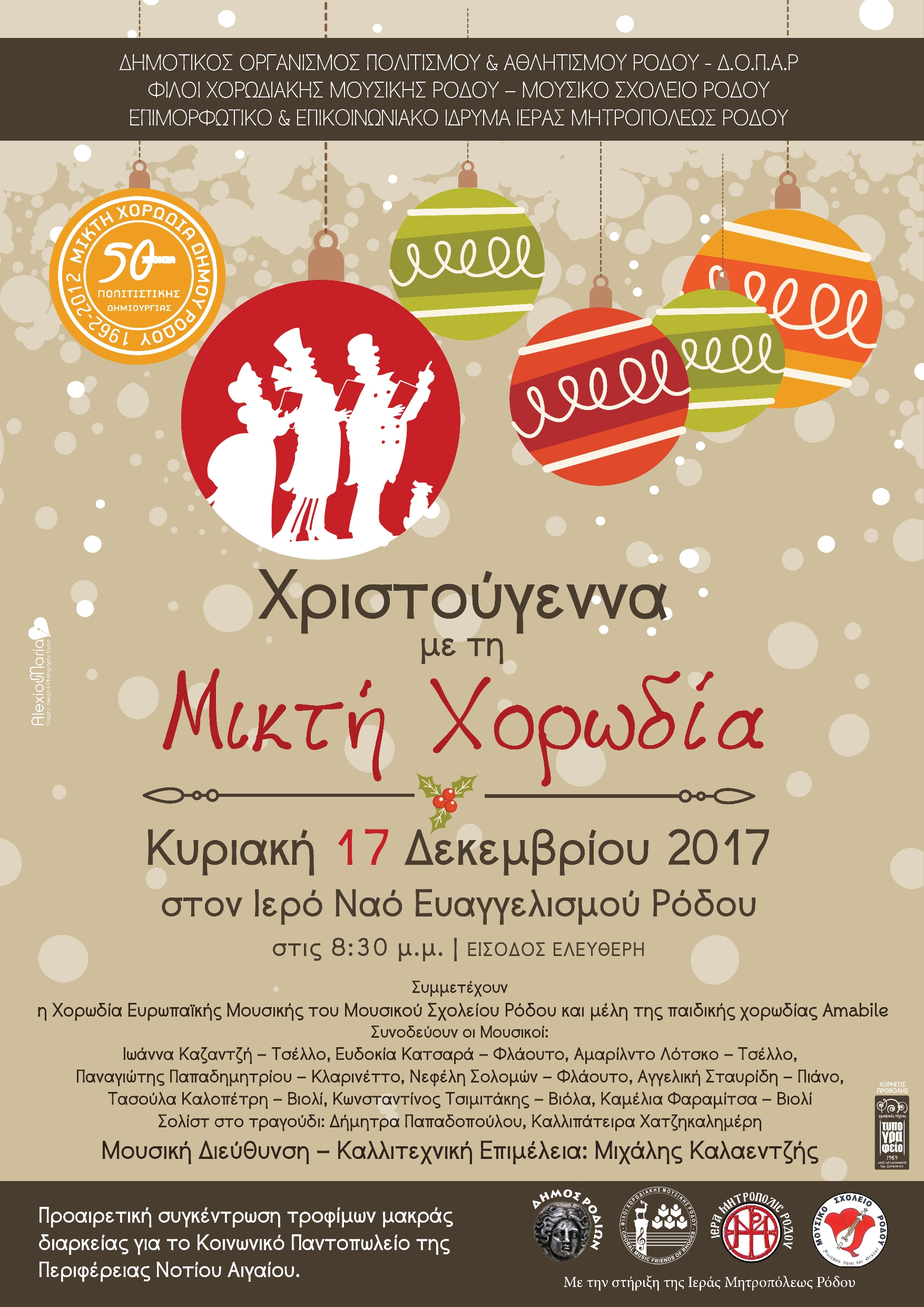 Η Μικτή Χορωδία, υπό τη διεύθυνση του καθηγητή μουσικής και καταξιωμένου μαέστρου κ. Μιχάλη Καλαεντζή, ολοκληρώνει έτσι με τον καλύτερο τρόπο το 55ο έτος λειτουργίας και καλλιτεχνικής συμμετοχής της στο πολιτιστικό γίγνεσθαι του τόπου μας. «Αειφόρα», αεικίνητη και «πανταχού παρούσα», δεν θα μπορούσε παρά με το φως του δικού της “άστρου” να στείλει και φέτος στις καρδιές μας το μήνυμα της επικείμενης έλευσης του Χριστού. Το πρόγραμμα είναι έτσι διαρθρωμένο, ώστε το κοινό από την αρχική κατάνυξη να διέλθει στην ατμόσφαιρα της ελπιδοφόρας προσμονής και της ψυχικής ανάτασης για την επικείμενη γέννηση του Θεανθρώπου και την έλευση της νέας χρονιάς. Στη συναυλία της Κυριακής συμπράττουν, ως είθισται, η Παιδική-Νεανική Χορωδία Amabile, του Επιμορφωτικού και Επικοινωνιακού Ιδρύματος της Ιεράς Μητροπόλεως Ρόδου και η πολυβραβευμένη Χορωδία Ευρωπαϊκής Μουσικής του Μουσικού Σχολείου Ρόδου. Την ευθύνη διδασκαλίας την καλλιτεχνική επιμέλεια και την μουσική διεύθυνση όλων των χορωδιών έχει ο κ. Μ. Καλαεντζής. Στη συναυλία θα ακουστούν έργα Ελλήνων και ξένων δημιουργών, υπό τη συνοδεία μουσικής από σχήμα αποτελούμενο από εγνωσμένης αξίας μουσικούς: Ιωάννα Καζαντζή – Τσέλλο, Εύη Κατσαρά – Φλάουτο, Αμάριλντο Λότσκο – Τσέλλο, Παναγιώτης Παπαδημητρίου – Κλαρινέττο, Νεφέλη Σολομών – Φλάουτο, Αγγελική Σταυρίδη – Πιάνο, Τασούλα Καλοπέτρη – Βιολί, Κωνσταντίνος Ταμπάκης – Βιόλα, Καμέλια Φαραμίτσα – Βιολί. Σολίστ στο τραγούδι: Δήμητρα Παπαδοπούλου, Καλλιπάτειρα Χατζηκαλημέρη. Η εκδήλωση διοργανώνεται από τον Δ.Ο.Π.Α.Ρ. και το σύλλογο «Φίλοι Χορωδιακής Μουσικής Ρόδου», ενώ συμπράττουν το Μουσικό Σχολείο Ρόδου και το Επιμορφωτικό και Επικοινωνιακό Ίδρυμα της Ιεράς Μητροπόλεως Ρόδου. Στην είσοδο του Ιερού Ναού θα γίνεται προαιρετική συγκέντρωση τροφίμων μακράς διαρκείας για το Κοινωνικό Παντοπωλείο της Περιφέρειας Νοτίου Αιγαίου.