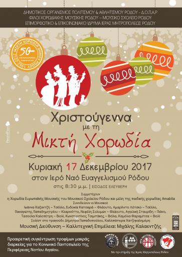 ΜΕΓΑΛΗ ΧΡΙΣΤΟΥΓΕΝΝΙΑΤΙΚΗ ΣΥΝΑΥΛΙΑ ΜΙΚΤΗΣ ΧΟΡΩΔΙΑΣ ΔΗΜΟΥ ΡΟΔΟΥ. ΚΥΡΙΑΚΗ 17-12-2017, 8.30 ΜΜ, ΙΕΡΟΣ ΝΑΟΣ ΕΥΑΓΓΕΛΙΣΜΟΥ. Σε μια ακόμη ξεχωριστή, ποιοτική βραδιά προσκαλεί τους πολίτες η Μικτή Χορωδία Δήμου Ρόδου, την προσεχή Κυριακή 17 Δεκεμβρίου 2017, στις 8.30 μμ, στον Ιερό Ναό του Ευαγγελισμού της Θεοτόκου, στην καθιερωμένη χριστουγεννιάτικη συναυλία της.