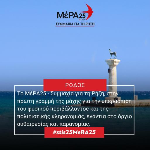 Ήταν και Είναι το ΜέΡΑ25-Συμμαχία για τη Ρήξη που δεν δίστασε να κατονομάσει, να υπερασπιστεί την νομιμότητα, να θέσει το δάκτυλο επί τον τύπον των ήλων και να υπερασπιστεί το δικαίωμα των κατοίκων της Ρόδου στην ελεύθερη πρόσβαση του κοινόχρηστου δημόσιου αγαθού, που είναι ο αιγιαλός.