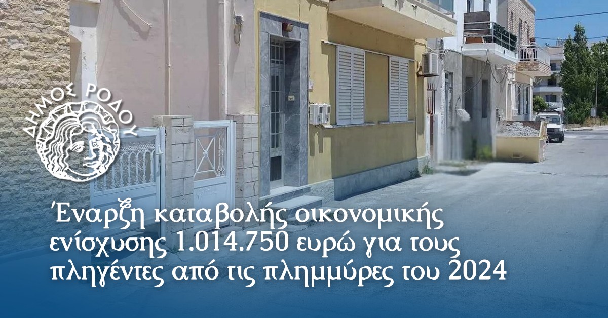 Με απόφαση του Δημάρχου Ρόδου, Αλέξανδρου Κολιάδη, ξεκινά άμεσα η καταβολή οικονομικής ενίσχυσης ύψους 1.014.750 ευρώ προς 432 συνολικά δικαιούχους, οι οποίοι επλήγησαν από τα ακραία πλημμυρικά φαινόμενα που σημειώθηκαν στη Ρόδο από τις 30 Νοεμβρίου έως και τις 3 Δεκεμβρίου 2024.