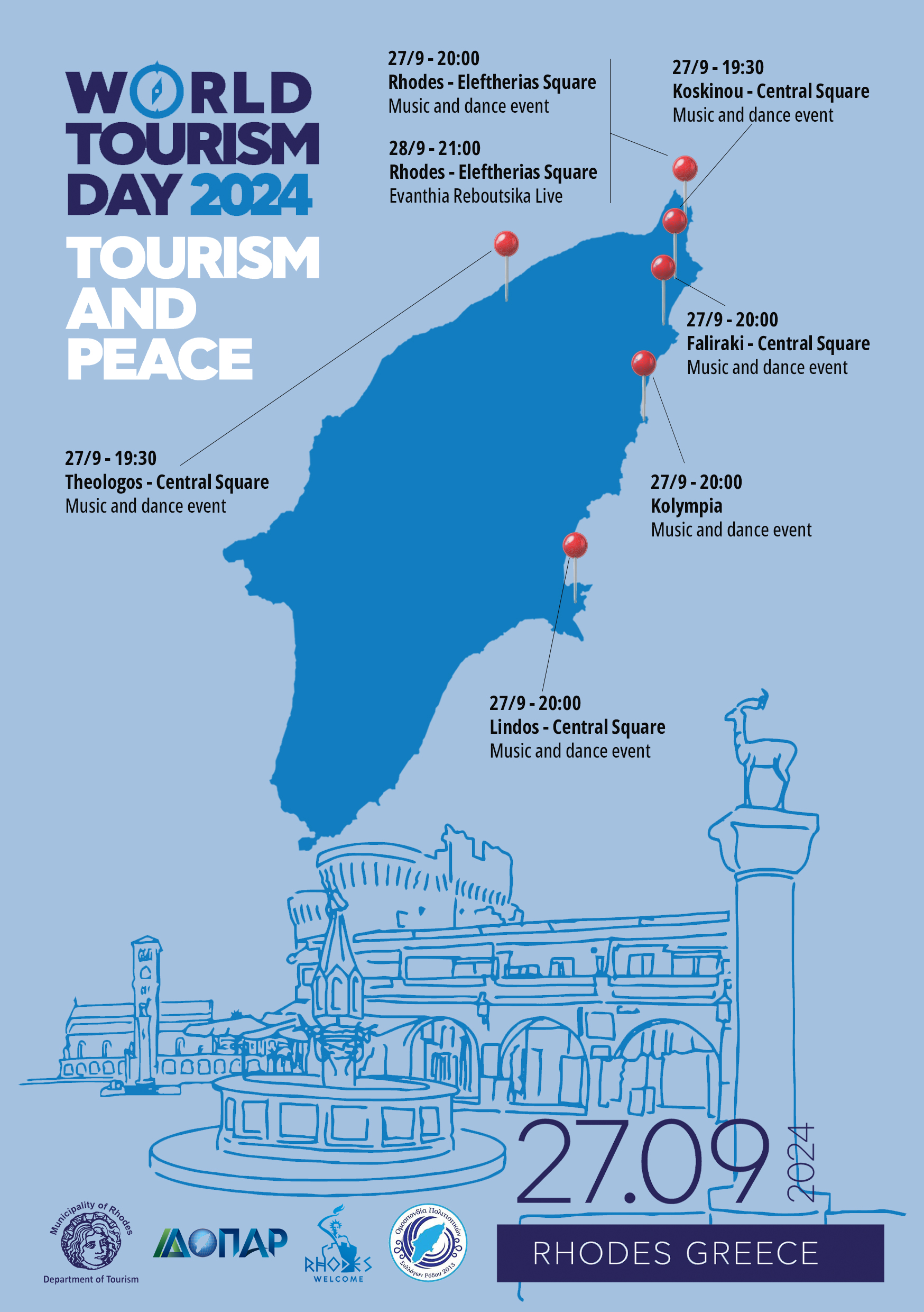 Οι εκδηλώσεις του Δήμου Ρόδου για την Παγκόσμια Ημέρα Τουρισμού 2024 με τίτλο «Μουσικές Βραδιές Τουρισμού» ξεκινούν από τις 27 Σεπτεμβρίου 2024 στην πόλη της Ρόδου και σε κοινότητες του νησιού και θα κορυφωθούν με τη συναυλία της κορυφαίας καλλιτέχνιδας Ευανθίας Ρεμπούτσικα και της ορχήστρας της, την επόμενη ημέρα 28 Σεπτεμβρίου 2024, στις 9 μμ μπροστά στο Δημαρχείο.