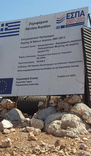 Είναι η γνωστή επιγραφή της Ευρωπαϊκής Ένωσης και του Ευρωπαϊκού Ταμείου Περιφερειακής Ανάπτυξης που αφορά το επιχειρησιακό πρόγραμμα των νησιών του Αιγαίου. Η συγκεκριμένη γράφει στην ονομασία του έργου που πραγματοποιήθηκε «Αποκατάσταση – Διαμόρφωση Ακρόπολης Παλαιοκάστρου Μεγίστης και Αρχαίου Οχυρού Ρω». Είναι το ΕΣΠΑ. Αυτό που δεν υπάρχει σαν μάθημα στα σχολεία και που όλοι μας, λίγο πολύ, από τα μαθητικά μας χρόνια θεωρούμε κάτι δεδομένο που με «αυτόματο» τρόπο χρηματοδοτείται και πραγματοποιείται (…). Γράφει ακόμα για τον προϋπολογισμό και το ποσό στο οποίο ανέρχεται, τον ανάδοχο που είναι η ΚΒ’ Εφορεία Προϊστορικών και Κλασικών Αρχαιοτήτων και ακόμα πιο κάτω «με την συγχρηματοδότηση της Ελλάδας και της Ευρωπαϊκής Ένωσης. Οι τελευταίες τρεις λέξεις είναι «Στηρίζει ότι αξίζει».