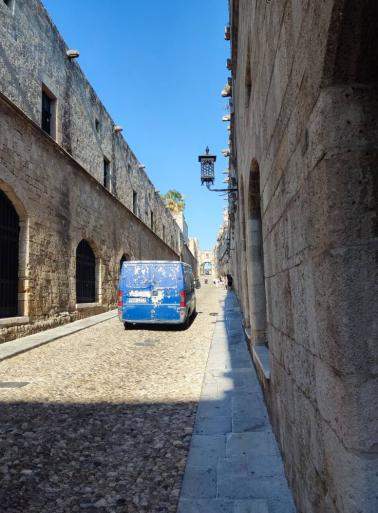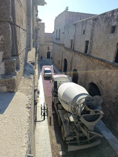 Σήμερα στην οδό των Ιπποτών που ξεκινά από την πλατεία του αρχαιολογικού μουσείο και καταλήγει στην πλατεία Κλεοβούλου και το παλάτι του μεγάλου Μάγιστρου, δεν κυκλοφορούν οι ιππότες με τα άλογα τους. Κυκλοφορούν χιλιάδες επισκέπτες, που νιώθουν την επιρροή αυτού του μοναδικού μεσαιωνικού δρόμου γεμάτου ιστορίες και μύθους. Κυκλοφορούν όμως καθημερινά και υπέρβαρες μπετονιερες, υπερφορτωμένα οχήματα προμηθευτών παρά τις επανειλημμένες συστάσεις μας και οχήματα μεταφοράς συνεργείων χωρίς τον παραμικρό σεβασμό στην ιστορία της. Μάταια το συνεργείο μας τον τελευταίο καιρό προσπαθεί να κρατήσει την βατότητα της ασφαλή. Χθες επισκευάστηκαν πάνω από δέκα σημεία με ζημιές.