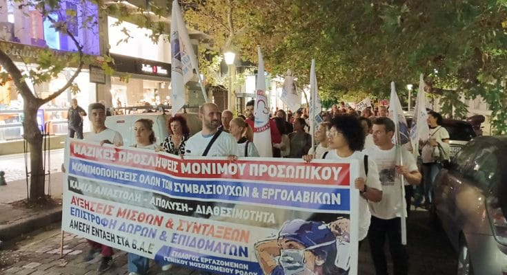 Μπροστά στα τρέχοντα σοβαρά προβλήματα υποστελέχωσης και υποχρηματοδώτησηςπου αντιμετωπίζει το Γενικό Νοσοκομείο Ρόδου, το ΕΚΑΒ και τα Κέντρα Υγείας – ΠΙ, καλούμε όλα τα εργατικά σωματεία πρωτοβάθμια και δευτεροβάθμια, τους πολιτιστικούς και αθλητικούς συλλόγους, τους συλλόγους γονέων και γενικά όλο τον λαό της Ρόδου να συμπαραταχθεί στα αιτήματα που θέτουμε οι εργαζόμενοι, οι χρόνια πάσχοντες ασθενείς και εθελοντές αιμοδότες. Το κράτος μας φορτώνει με δυσβάσταχτους φόρους, γι’ αυτό και απαιτούμε από το κράτος την άμεση ικανοποίηση των αιτημάτων μας. Η δικαιολογίες ότι δεν υπάρχουν χρήματα δεν γίνονται δεκτές. Ζούμε στην Ρόδο και γνωρίζουμε από πρώτο χέρι τι πλούτος και τι κέρδη βγαίνουν στις πλάτες μας κάθε τουριστική σεζόν για λογαριασμό των λίγων. Επίσης γνωρίζουμε τις προθέσεις της κυβέρνησης, να παραδώσει την υγεία ολοκληρωτικά σε αυτούς τους λίγους, για να βγάζουν αμύθητα κέρδη και από την πώληση παροχών υγείας. Σας καλούμε να καταδικάσουμε την σημερινή κατάσταση στις δημόσιες δομές υγείας στο νησί μας και την πολιτική απαξίωσης τους από την σημερινή και όλες τις προηγούμενες κυβερνήσεις και να απαιτήσουμε την άμεση ικανοποίηση των αιτημάτων μας. Να σταματήσει κάθε προσπάθεια ιδιωτικοποιήσει των δημόσιων δομών υγείας είτε μέσω ΣΔΙΤ (σύμπραξη δημόσιου – ιδιωτικού τομέα) είτε μέσω της διάλυσης και του κλεισίματος κλινικών και τμημάτων του νοσοκομείου.