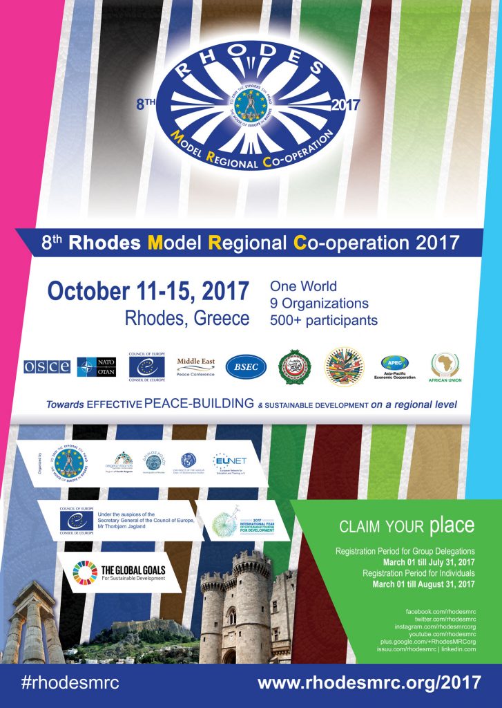 Μετά από σχετικό αίτημα της Οργανωτικής Επιτροπής, το Διεθνές Συνέδριο Προσομοίωσης Διεθνών Περιφερειακών Οργανισμών Ρόδου ή RhodesMRC εντάχθηκε επίσημα στο ημερολόγιο του Παγκόσμιου Οργανισμού Τουρισμού για τους εορτασμούς του Διεθνούς Έτους Βιώσιμου Τουρισμού για την Ανάπτυξη. Δείτε το σχετικό σύνδεσμο εδώ: http://www.tourism4development2017.org/events/rhodes-model-regional-co-operation-2017/ -Το RhodesMRC 2017 αναγνωρίσθηκε ως επίσημη εκδήλωση του Διεθνούς Έτους Βιώσιμου Τουρισμού για δύο βασικούς ρόλους: 1. αποτελεί ένα εξαιρετικό παράδειγμα ακαδημαϊκού τουρισμού που εκκολάπτει ταξιδιώτες που εκτιμούν τη διαφορετικότητα, σέβονται την πολιτιστική κληρονομιά και ανακαλύπτουν τον τόπο φιλοξενίας τους και 2. συμπεριλαμβάνει στην ατζέντα των προσομοιούμενων επιτροπών του θέματα σχετικά με τον τουρισμό και την βιωσιμότητα.