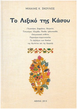 Νέες εκδόσεις: Μιχάλης Κ. Σκουλιός «Το Λεξικό της Κάσου» -«Το Λεξικό της Κάσου», τόμος 450 σελίδων (17,5 Χ 24,5 εκ.μ. έγχρωμο σκληρό εξώφυλλο) η παρουσίασή του οποίου, θα γίνει φέτος το καλοκαίρι στην Κάσο στο πλαίσιο των πολιτιστικών πνευματικών εκδηλώσεων. «Το Λεξικό της Κάσου», αποτελεί ένα αποθησαύρισμα από σπάνιες παλιές και σύγχρονες ντόπιες λέξεις. Λέξεις ιδιωματικές, σχετικά με τα τοπωνύμια του νησιού, με αναφορά και στις γεωγραφικές συντεταγμένες τους. Αλλά και άλλες για τη χλωρίδα, την πανίδα καθώς και εκείνη της θάλασσας. Λέξεις ξεχασμένες από την τεχνική ναυτική ορολογία, την πρακτική, την ιατρική και τη φαρμακευτική. Είναι λέξεις που χρησιμοποιούσαν στην καθημερινότητά τους εκατοντάδες μαστόρων, βοσκών, γεωργών, ναυτικών, εμπόρων και άλλων επαγγελματιών και πολλές παραμένουν ζωντανές. Λέξεις που σκοπό τους είχαν να αποδώσουν το νόημα όπως αυτοί το καταλάβαιναν, όπως το αισθάνονταν. Οι λέξεις αυτές, πολλές από τις οποίες ακούγονταν κατά τον προηγούμενον αιώνα αλλά και σύγχρονες, έχουν ρίζες αρχαίες, βυζαντινές, μεσαιωνικές. Κάποιες χρησιμοποιούνται και σε αρκετά άλλα μέρη της Ελλάδας, όπως στη γειτονική Κρήτη και στα Δωδεκάνησα. Και μεταξύ αυτών υπάρχουν λέξεις δανεικές, εισαγόμενες από άλλους τόπους της γης που ταξίδεψαν με τους ναυτικούς μας ή έφεραν στο νησί οι Κασιώτες της διασποράς και ρίζωσαν με τα χρόνια στο καθημερινό λεξιλόγιο, πολιτογραφήθηκαν και παρέμειναν μέχρι τα νεώτερα χρόνια. Ωστόσο, δεν έπαψαν να χρησιμοποιούνται ακόμη και σήμερα σε κάθε λαϊκή έκφραση, στο αφήγημα, στην παραδοσιακή ποίηση, στο τραγούδι αλλά και στον γραπτό λόγο σε αρκετά ιδιωτικά έγγραφα και λογοτεχνικά έργα. «Το Λεξικό της Κάσου», είναι ένα συλλεκτικό βιβλίο, ιδιαίτερης σημασίας. Το περιεχόμενό του αποτελεί κιβωτό πληροφοριών όχι μόνο για τους ανθρώπους του μικρού νησιού, αλλά και για τους γλωσσολόγους και όλους εκείνους που ασχολούνται με τη διαμόρφωση της γλώσσας μας, καθώς και με τους παράγοντες που συντελούν στη γλωσσική διαφοροποίηση και ποικιλία, διαχρονικά.