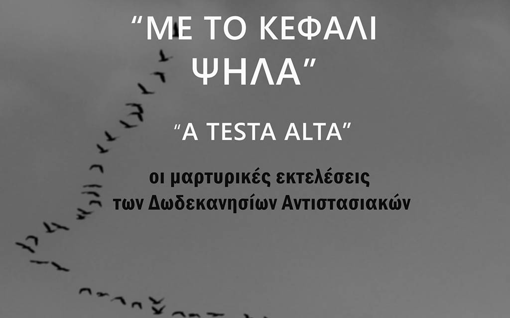 Με αφορμή τον ετήσιο εορτασμό της Ενσωμάτωσης της Δωδεκανήσου στη μητέρα Ελλάδα, στις 7 Μαρτίου, η σειρά: «Μια σταγόνα Ροδιακής Ιστορίας» σε συνεργασία με τον «Όμιλο Cine-Εκπαίδευση για τον οπτικοακουστικό εγγραμματισμό» προβάλλουν την Παρασκευή 8 Μαρτίου 2024 στις 20:00μ.μ. το βράδυ στο Δημοτικό Θέατρο Ρόδου, το νέο ιστορικό ντοκιμαντέρ: «ΜΕ ΤΟ ΚΕΦΑΛΙ ΨΗΛΑ – Α TESTAALTA» του δικηγόρου, σκηνοθέτη και συντονιστή τού κινηματογραφικού εργαστηρίουCine-ChevalierΓιώργου Τζεδάκη.