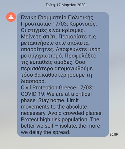 Νέο μήνυμα από τη Γενική Γραμματεία Πολιτικής Προστασίας στα κινητά: Οι στιγμές είναι κρίσιμες - Μείνετε στο σπίτι! Όσο περισσότερο απομονωθούμε, τόσο περισσότερο θα περιορίσουμε τη διασπορά του ιού!