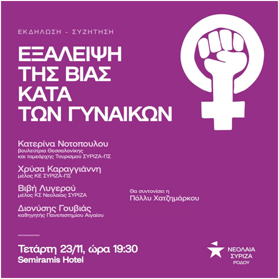 Η Νεολαία Σύριζα Ρόδου σας προσκαλεί στην εκδήλωση που θα πραγματοποιήσει την Τετάρτη 23 Νοεμβρίου με θέμα «ΕΞΑΛΕΙΨΗ ΤΗΣ ΒΙΑΣ ΚΑΤΑ ΤΩΝ ΓΥΝΑΙΚΩΝ» στο ξενοδοχείο Semiramis στην αίθουσα Phaedra ώρα 19:30.