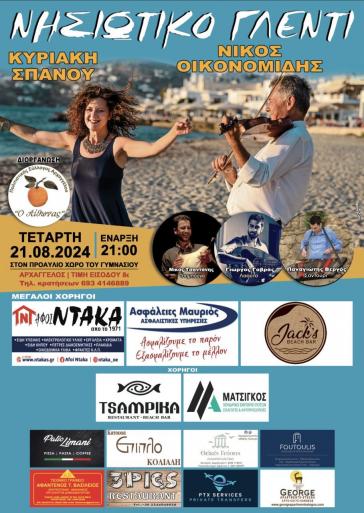 Ο Πολιτιστικός Σύλλογος Αρχαγγέλου "Αίθωνας" σας προσκαλεί στη μουσική εκδήλωση «ΝΗΣΙΩΤΙΚΟ ΓΛΕΝΤΙ»με τονΝίκο Οικονομίδη και την Κυριακή Σπανού, την Τετάρτη 21Αυγούστου στις 20.00 στον αύλειο χώρο του Γυμνασίου Αρχαγγέλου. Την εκδήλωση στηρίζει η Δημοτική Κοινότητα Αρχαγγέλου.