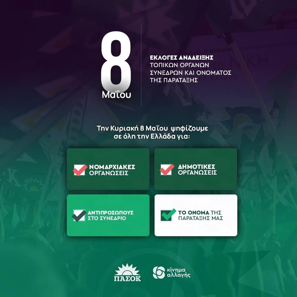 - Την Κυριακή 8 Μαΐου θα διεξαχθούν σε όλη την χώρα εκλογές για την ανάδειξη νέων Νομαρχιακών Επιτροπών και Τοπικών Οργανώσεων, Συνέδρων για το 3ο Συνέδριο του Κινήματος Αλλαγής και για την επιλογή του ονόματος της Παράταξης.