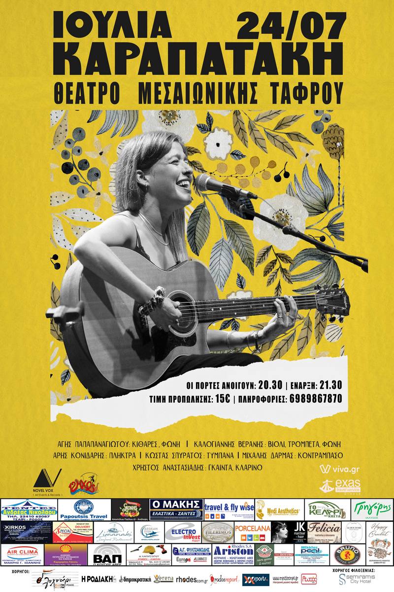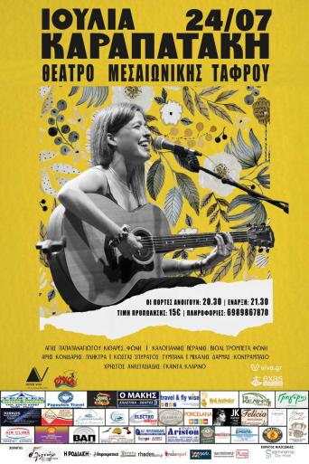 Η χαμογελαστή και γεμάτη θετική ενέργεια Ιουλία, μετά τις soldout εμφανίσεις στην Αθήνα αλλά και στην επαρχία τον Χειμώνα έρχεται μαζί με την μπάντα της, στη Ρόδο στο Θέατρο Μεσαιωνικής Τάφρου την Δευτέρα 24 Ιουλίου για μια μοναδική εμφάνιση.