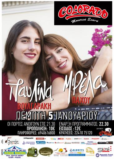 Μετά τις επιτυχημένες τους εμφανίσεις στο Σταυρό του Νότου ,οι δυο νέες τραγουδοποιοί συναντιούνται ξανά στη μουσική σκηνή του Colorado την Πέμπτη 5 Ιανουαρίου σε μια ξεχωριστή μουσική παράσταση γεμάτη δυναμισμό κι ευαισθησία, φαντασία και ανατροπές, φρεσκάδα και τρυφερότητα. Μιρέλα και Παυλίνα θα παρουσιάζουν ένα πρόγραμμα που θα διασκεδάσει και θα συγκινήσει. Μαζί με τα δικά τους τραγούδια θα παίξουν και αυτά που αγαπάνε σε πρωτότυπες διασκευές αλλά και ότι φέρει η στιγμή. Δύο παράλληλες πορείες συναντιούνται για πρώτη φορά: Από τη μια η αισθαντική τραγουδοποιός Παυλίνα Βουλγαράκη, δύο χρόνια μετά την επιτυχημένη κυκλοφορία του πρώτου της δίσκου «Λαβύρινθοι» (2014), με το ομώνυμο τραγούδι καθώς και τα «Λίγο Λίγο» και «Εδώ» να γίνονται επιτυχίες, έχοντας ήδη πραγματοποιήσει σημαντικές συνεργασίες με: Βελεσιώτου, Κότσιρα, Μαχαιρίτσα, Μητσιά, Στόκα και ετοιμάζοντας τον δεύτερο δίσκο, η κυκλοφορία του οποίου θα γίνει στα τέλη του τρέχοντος έτους. Και από την άλλη ηΜιρέλαΠάχου, το«δεξί χέρι» του Μίλτου Πασχαλίδη τα τελευταία έξι χρόνια αλλά και συχνή συνεργάτης του Λαυρέντη Μαχαιρίτσα, του Διονύση Σαββόπουλου, του Θάνου Μικρούτσικου κ.ά. έχει κερδίσει την αγάπη του κοινή για το εξαιρετικό ταλέντο της και ως μουσικός και ως ερμηνεύτρια. Με τον πρώτο προσωπικό της δίσκο «Μιρέλα» να γνωρίζει μεγάλη επιτυχία, ειδικά το ομώνυμο τραγούδι αλλά και το «Μαξιλάρι», το «Δύο και Κάτι» και άλλα. Την Πέμπτη 5 Ιανουαρίου στη μουσική σκηνή του Colorado η Παυλίνα κι η Μιρέλα μας ταξιδεύουν στους “Λαβύρινθους” της “Αλίκης” με αγαπημένα τραγούδια, ελληνικά και ξένα, γνωστά και ολοκαίνουρια. Μαζί τους οι μουσικοί: Δημήτρης Μουτάφης: μπάσο Δημήτρης Σινογιάννης: ηλεκτρική κιθαρα Γιώργος Σαρίκος: τύμπανα Άγγελος Κατσέλης: ακουστική κιθάρα Δημήτρης Καραγιάννης: πνευστά Ανδρέας Γυφτάκης: πλήκτρα
