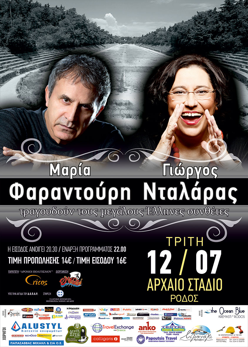 Για πρώτη φορά στην Ρόδο, οι δύο ερμηνευτές θα συναντηθούν επί σκηνήςστο μαγικό ιστορικό χώρο του Αρχαίου Σταδίου και θα ερμηνεύσουν,μαζί με μια εξαίρετη ομάδα μουσικών, το πρόγραμμα που παρουσιάστηκε πρόσφατα με μεγάλη επιτυχία (sold-out) στο θέατρο Παλλάς στην Αθήνα, καθώς επίσης στην Ευρώπη και μάγεψε κοινό και κριτικούς. Στην παράσταση θα συμμετέχει η Μικτή Χορωδία του Δήμου Ρόδου.Μια συναυλία που δεν πρέπει να χάσει κανείς! Η Είσοδος Ανοίγει: 20.30 Έναρξη προγράμματος: 22.00 Τιμή προπώλησης:14 ευρώ Τιμή εισόδου: 16 ευρώ