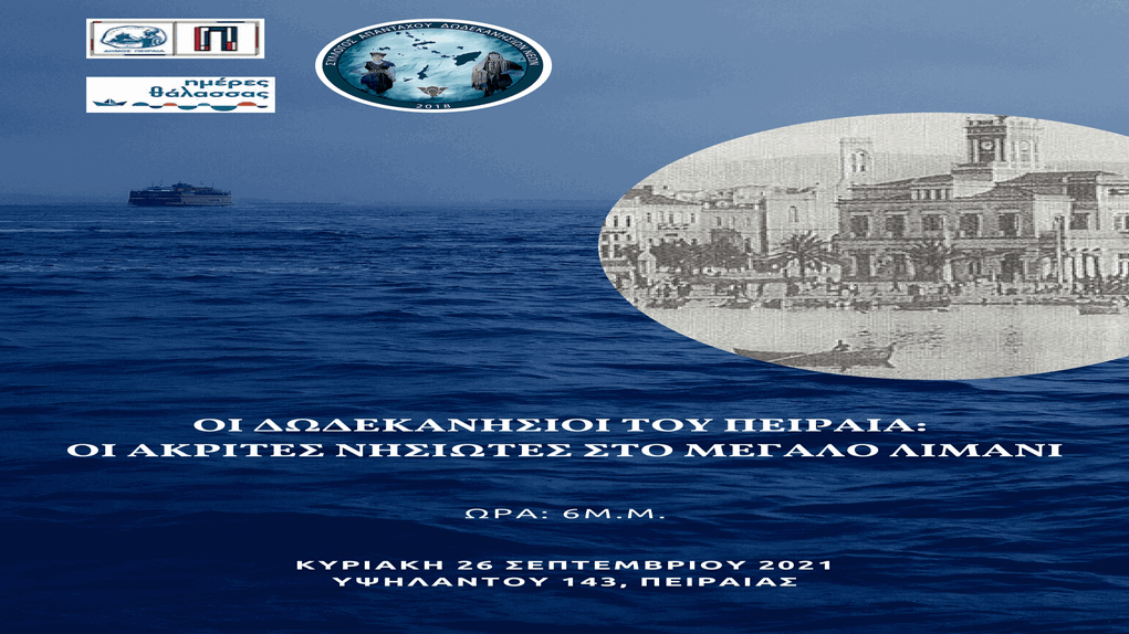 Η ημερίδα θα λάβει χώρα την Κυριακή 26 Σεπτεμβρίου και ώρα 6 μ.μ. στη Δωδεκανησιακή Εστία, Υψηλάντου 143,185 35 Πειραιάς, 1ος όροφος και τελεί υπό την αιγίδα του Δήμου Πειραιά μέσα από τη δράση "ΗΜΕΡΕΣ ΘΑΛΑΣΣΑΣ 2021".