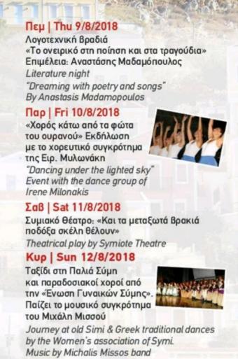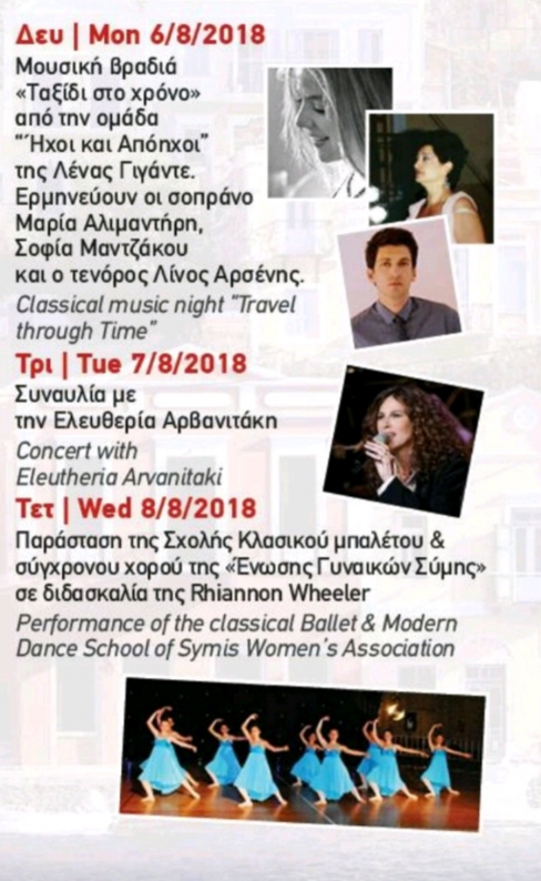 Συνεχίζεται με σημαντικές εκδηλώσεις το Φεστιβάλ Σύμης. Το εβδομαδιαίο πρόγραμμα του Φεστιβάλ Σύμης 2018 από Δευτέρα 6 Αυγούστου έως και 12 Αύγουστου. Ή Είσοδος είναι ελεύθερη σε όλες τις εκδηλώσεις!