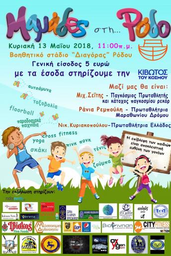 ΔΕΛΤΙΟ ΤΥΠΟΥ-Οι Μαμάδες γιορτάζουν και γυμνάζονται για καλό σκοπό! -O Δήμος Ρόδου – Δ.Ο.Π.Α.Ρ και Οι ΜΑΜΑΔΕΣ ΣΤΗ ΡΟΔΟ προσκαλούν όλες τις μαμάδες να γιορτάσουν αθλητικά τη γιορτή της μητέρας σε μία ξεχωριστή διοργάνωση! Αθλήματα ολυμπιακά, ατομικά ή ομαδικά, αθλήματα αντοχής , συγκέντρωσης, ευστοχίας, παραδοσιακά και πνευματικά παιχνίδια, καθώς και άλλα πολλά θα γυμνάσουν τις μαμάδες και τα παιδιά στις 13 Μαΐου στο Βοηθητικό Στάδιο Διαγόρας στις 11 π.μ. -Έμπειροι γυμναστές θα μας φέρουν σε επαφή με όλα τα είδη του αθλητισμού μαθαίνοντάς μας τεχνικές και δίνοντας χρήσιμες συμβουλές. Γνωρίστε νέα αθλήματα, τολμήστε να τα δοκιμάσετε και εμπλουτίστε την αθλητική σας ζωή με τένις, τοξοβολία, πινγκ-πονγκ, αυτοάμυνα, ζούμπα, floorball, cross fitness, yoga, Pilates, ενόργανη γυμναστική, σκάκι, αθλήματα στίβου, αναρρίχηση αλλά και ξαναζήστε ξέγνοιαστες στιγμές από τα παιδικά σας χρόνια παίζοντας αμπάριζα, τρίλιζα και κουτσό! Ας μεταδώσουμε στα παιδιά μας τις αξίες του αθλητισμού: την άμιλλα, τον συναγωνισμό, τη δύναμη, τη συνεργασία, την επιμονή, την επιβράβευση αλλά κυρίως την προσφορά στον συνάνθρωπο. Όλα τα έσοδα της διοργάνωσης θα διατεθούν για την κάλυψη αναγκών της Κιβωτού του Κόσμου, εκπρόσωπος της οποίας θα παρευρεθεί στη Ρόδο για τη διοργάνωση. Γενική είσοδος:5ευρώ. Μαζί μας θα βρίσκονται, για να στηρίξουν τον σκοπό μας πρότυπα του αθλητισμού, που ξεχώρισαν με τις αθλητικές τους διακρίσεις: ο Παγκόσμιος Πρωταθλητής Μιχάλης Σεϊτης, η πρωταθλήτρια Μαραθωνίου Δρόμου Ράνια Ρεμπούλη και η διεθνής αθλήτρια του άλματος επί κοντώ και Πρωταθλήτρια Ελλάδας Νικόλ Κυριακοπούλου.