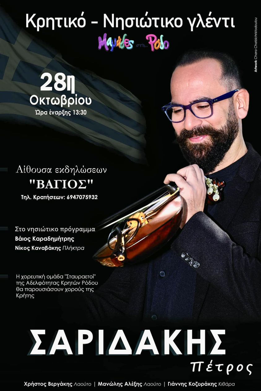 Νησιώτικα τραγούδια θα παίξουν ο λυράρης ΒάιοςΚαραδημήτρης καιθα συνοδεύει ο Νίκος Καναβάκης στα πλήκτρα. Συμμετέχει η χορευτική ομάδα της Αδελφότητας Κρητών Ρόδου «Σταυραετοί» ,που θα παρουσιάσουν χορούς της Κρήτης.