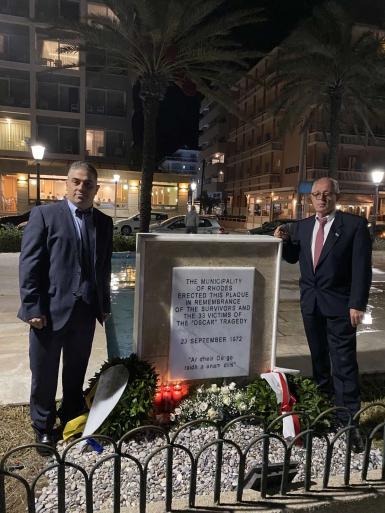 Τη θλιβερή επέτειο συμπλήρωσης 50 χρόνων, από την εκδήλωση της πυρκαγιάς στο εστιατόριο Oscar, τίμησαν οι προξενικές αρχές της Ρόδου, το απόγευμα της 23ης Σεπτεμβρίου 2022, σε μια σεμνή τελετή στην πλατεία Γαβριήλ Χαρίτου.