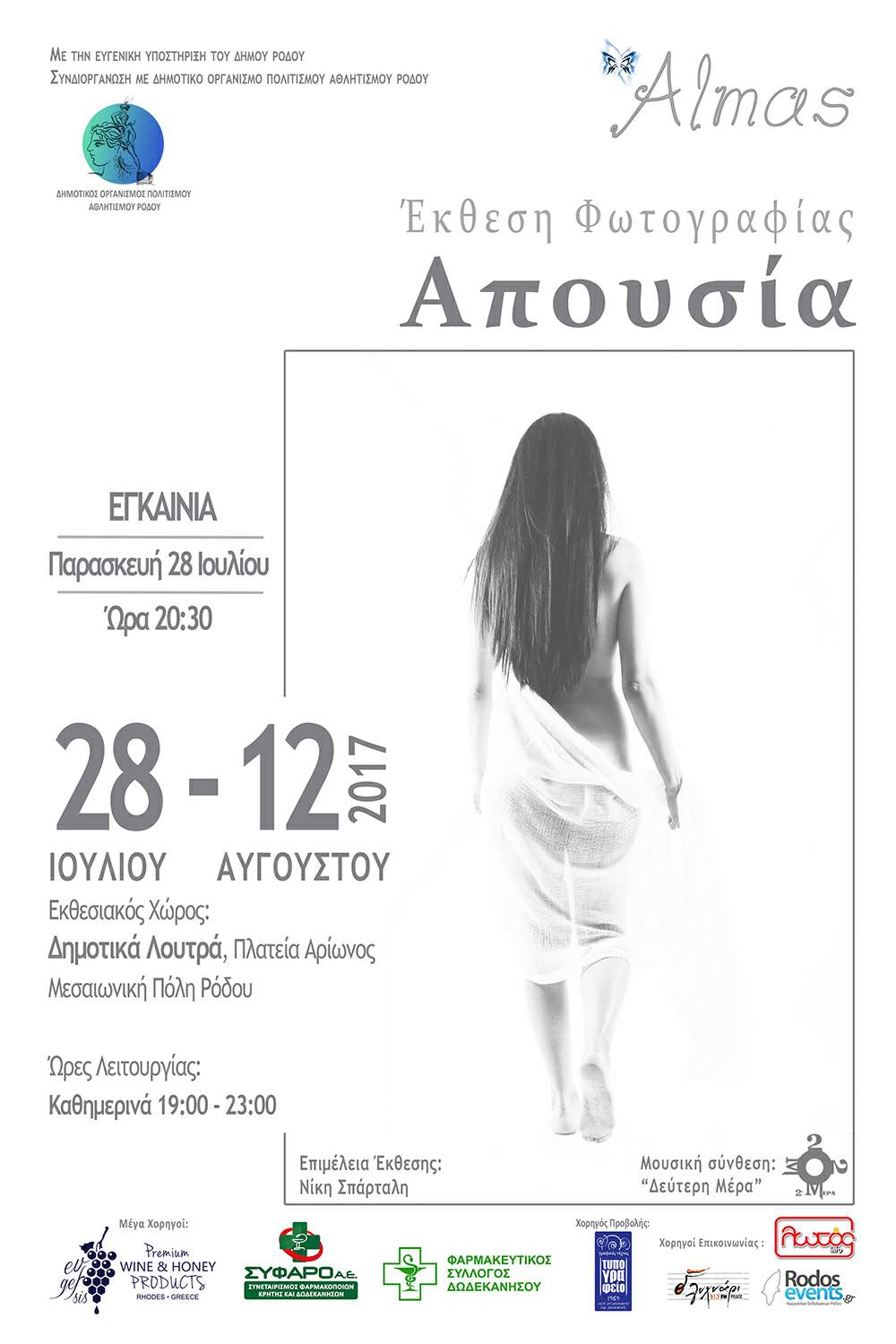 ΔΕΛΤΙΟ ΤΥΠΟΥ-Η Φωτογραφική Ομάδα Almas σε συνεργασία με τον ΔΟΠΑΡ, διοργανώνει ομαδική Έκθεση Φωτογραφίας με τίτλο «Απουσία» από τη Παρασκευή 28 Ιουλίου έως και το Σάββατο 12 Αυγούστου 2017 στα Δημοτικά Λουτρά, Πλατεία Αρίωνος στη Μεσαιωνική Πόλη της Ρόδου. Το θέμα της συγκεκριμένης έκθεσης προέκυψε μέσα από την ανάγκη να γίνει κάτι βιωματικό, να δουλέψει η ομάδα πέρα από τεχνικά στοιχεία της φωτογραφίας, μια έννοια χειροπιαστή, αρκετά έντονη στην σημερινή εποχή, κάτι που απασχολεί τον καθημερινό άνθρωπο … την Απουσία. Απουσία ζωής, απουσία χρόνου, απουσία συναισθημάτων… Έτσι ο κάθε ένας από τους συμμετέχοντες ξεχωριστά έψαξε να βρει τι τον προβληματίζει. Τι θεωρεί ότι λείπει περισσότερο στην καθημερινότητά του. Και να το καταγράψει.