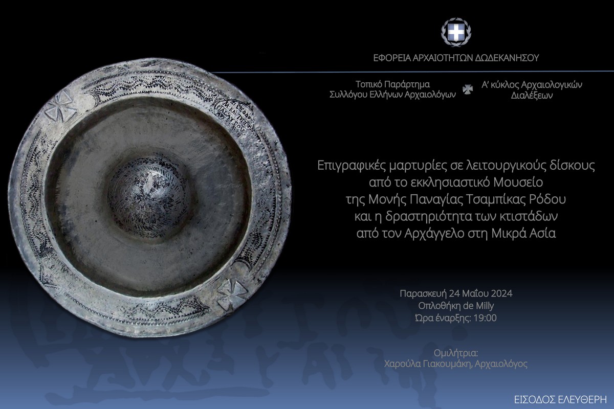 Σας περιμένουμε την Παρασκευή 24/5/2024 και ώρα 19:00 στην ομιλία της αρχαιολόγου κ. Χαρούλας Γιακουμάκη με τίτλο: "Επιγραφικές μαρτυρίες σε λειτουργικούς δίσκους από το εκκλησιαστικό Μουσείο της Μονής Παναγίας Τσαμπίκας Ρόδου και η δραστηριότητα των κτιστάδων από τον Αρχάγγελο στη Μικρά Ασία".