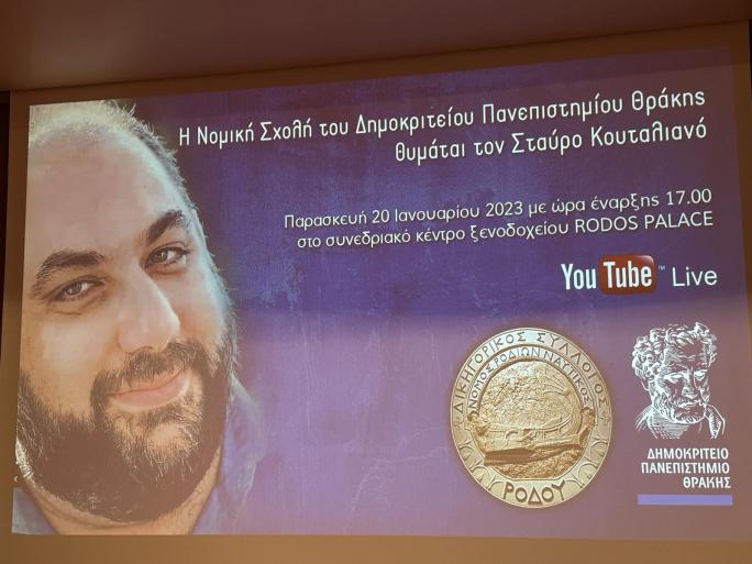 - Ακολουθεί το πλήρες κείμενο της ομιλίας του Δημάρχου Ρόδου Αντώνη Β. Καμπουράκη στην επιστημονική εκδήλωση Αστικού Δικονομικού Δικαίου στη μνήμη του Σταύρου Κουταλιανού με τίτλο «Η Νομική Σχολή του Δημοκριτείου Πανεπιστημίου Θράκης θυμάται τον Σταύρο Κουταλιανό»: