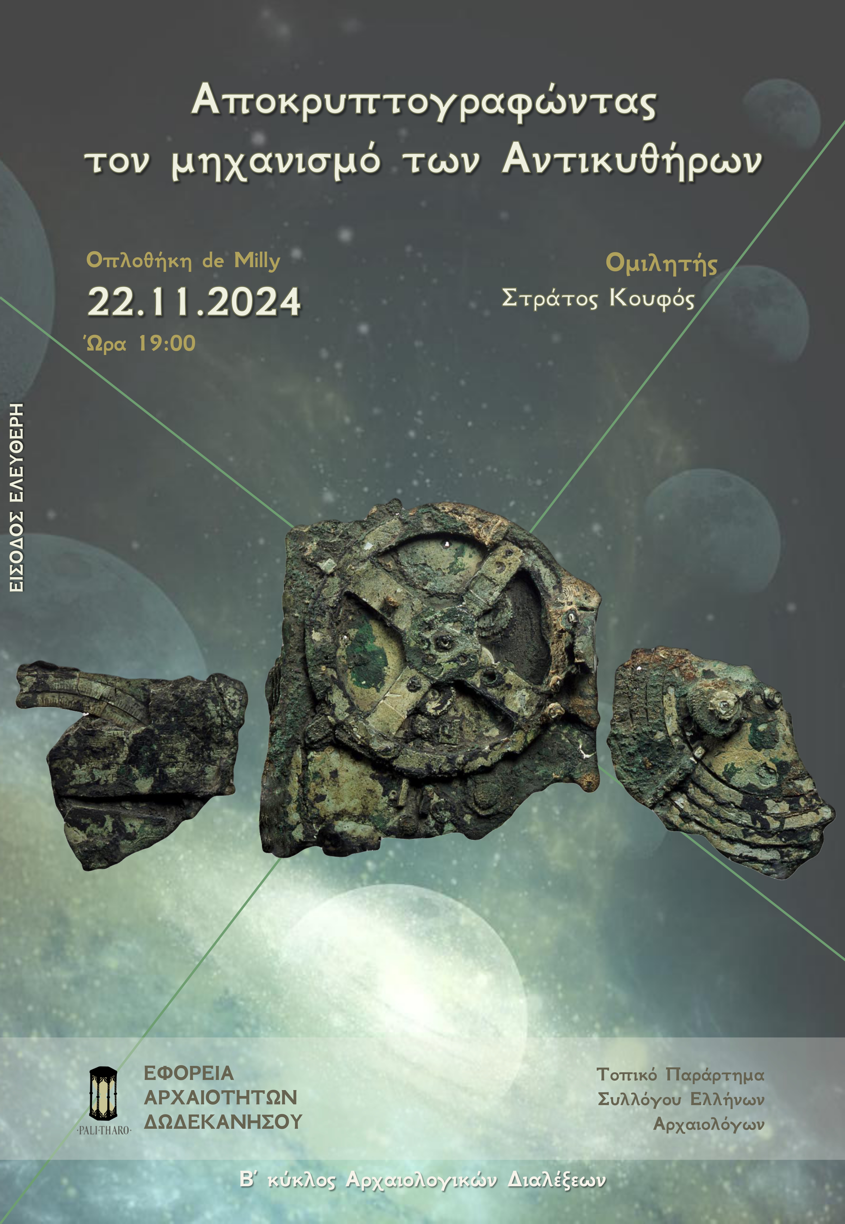 Σας περιμένουμε την Παρασκευή, 22-11 και ώρα 19:00, στην ομιλία του κ. Στρατού Κουφού, με τίτλο: "Αποκρυπτογραφώντας τον μηχανισμό των Αντικυθήρων" που θα πραγματοποιηθεί στο πλαίσιο του Β' Κύκλου Αρχαιολογικών Διαλέξεων της Εφορείας Αρχαιοτήτων Δωδεκανήσου και του Τοπικού Παραρτήματος του Συλλόγου Ελλήνων Αρχαιολόγων.