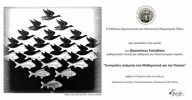 Η Unesco έχει ανακηρύξει την 14η Μαρτίου παγκόσμια μέρα των Μαθηματικών και την 21η Μαρτίου παγκόσμια μέρα της Ποίησης. Ανάμεσα στις δυο ημερομηνίες, το Σάββατο 16 Μαρτίου 2024 στις 6μμ, o Σύλλογος Αρχιτεκτονικής και Πολιτιστικής Κληρονομιάς Ρόδου διοργανώνει εκδήλωση - διάλεξη με θέμα «Συνομιλίες ανάμεσα στα Μαθηματικά και την Ποίηση» και προσκεκλημένο ομιλητή τον μαθηματικό και ποιητή Φραγκίσκο Καλαβάση, Καθηγητή του Πανεπιστημίου Αιγαίου και μόνιμο κάτοικο της Μεσαιωνικής πόλης.